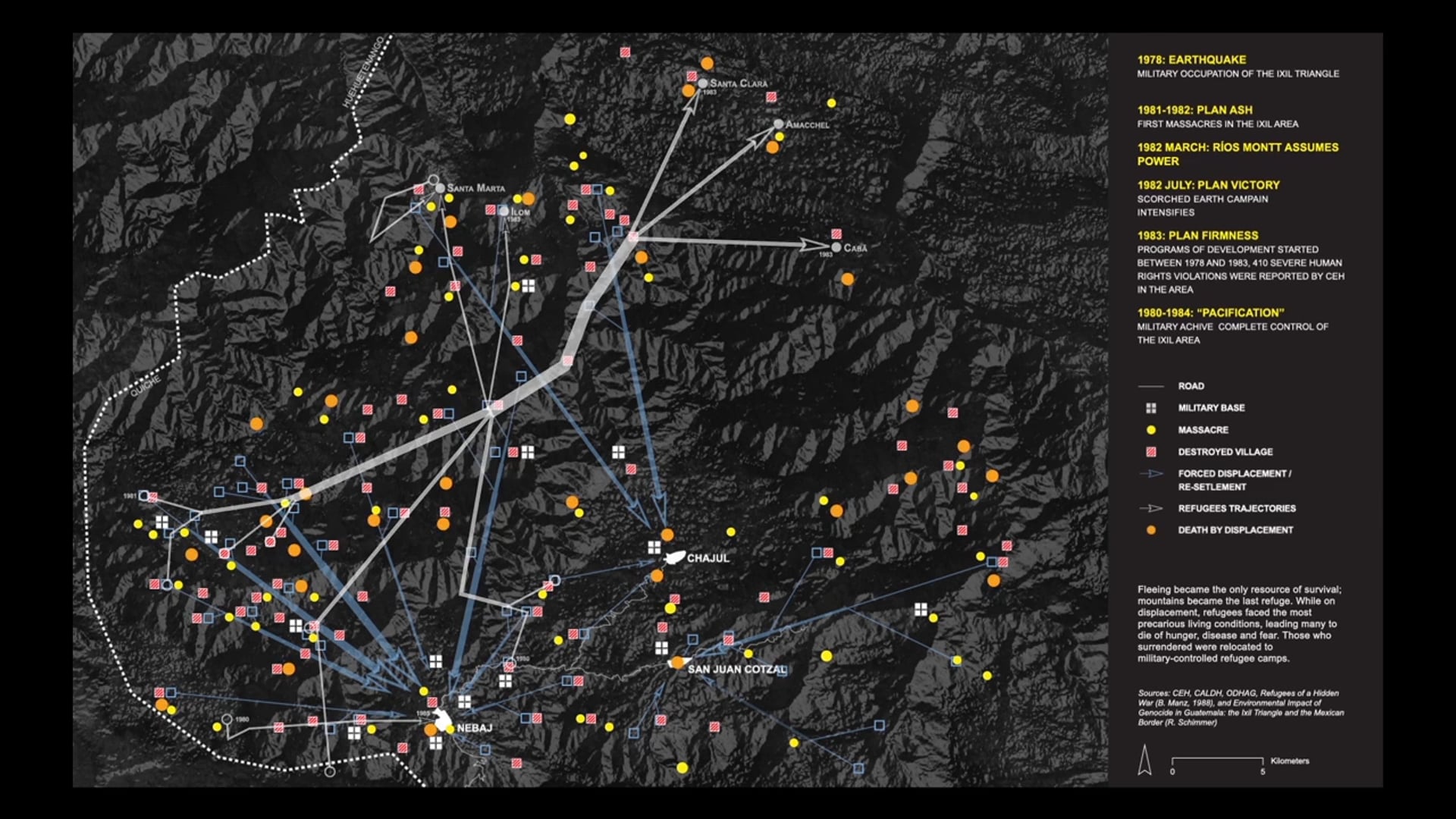 In the case of the violence perpetrated against the Ixil Maya, crimes against humanity and genocide could be understood in relation to transformations of the area’s urban and natural environments. We traced the intersections between military operations, population displacement and relocation, and transformations in the urban, agricultural, and forest areas of the Ixil Triangle during the most violent period of the conflict (1979-1984), with particular attention to the years of the Montt dictatorship (1982-1983). We analysed and subsequently presented that information through a series of time-based cartographies.