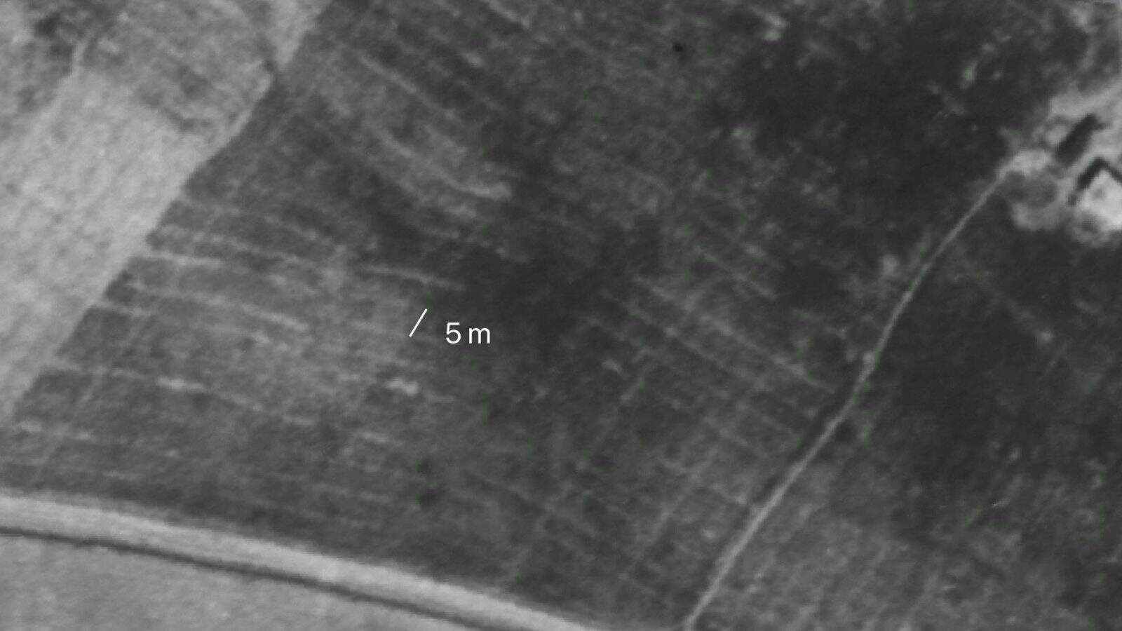 Al-Ma’in was on the southernmost edge of the Wadi Gaza basin, at the intersection of distinct environmental conditions suitable for growing wheat and barley. By 28 January 1945, when the RAF’s aerial images of al-Ma’in were taken, the wheat and barley would have grown to about a foot high, enough to form the ground cover that would render the field dark. Lighter patches were likely fields left fallow.