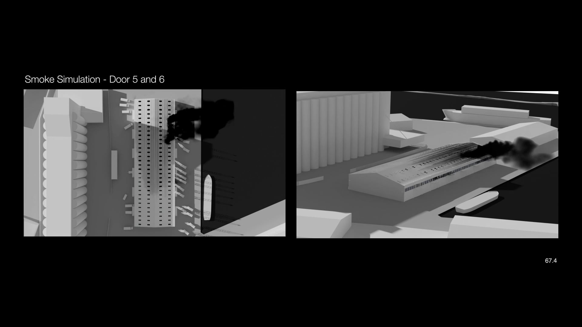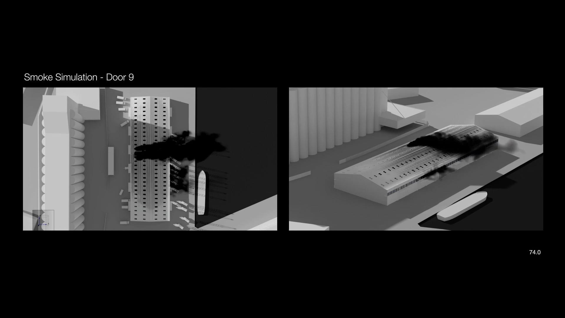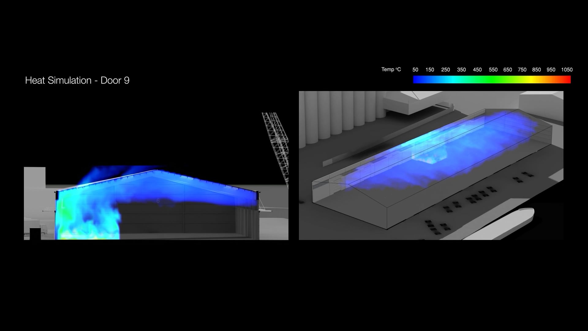 To have a point of comparison, we then asked Kindling to create a series of fire dynamics simulations of the fire’s movements had it started behind door 9 instead. These simulations, by contrast, did not correspond with the heat maps we had created nor with our visual analysis of the videos taken by witnesses at the scene.