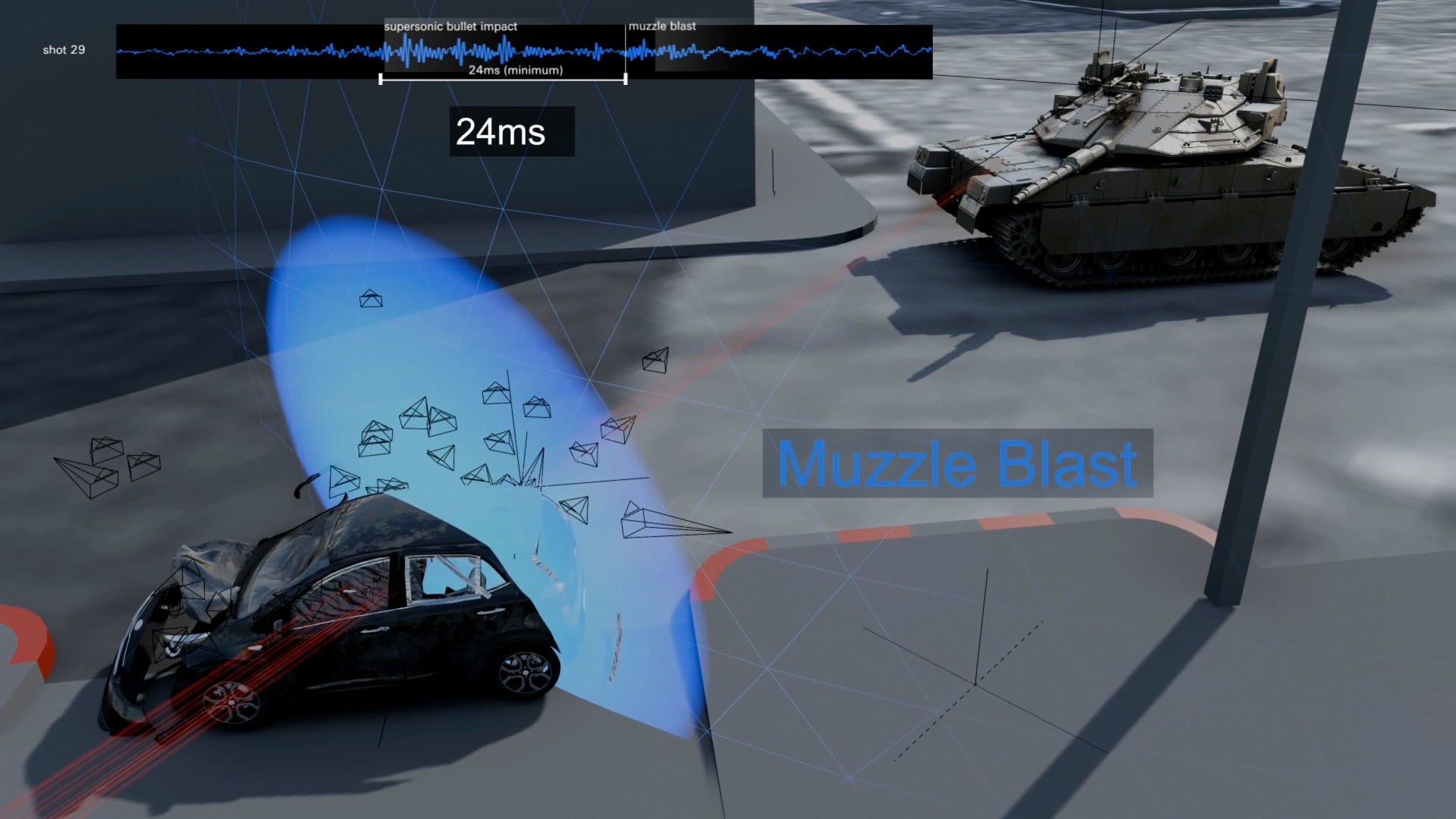When gunfire is captured by a recording device, there are two distinct sounds that are typically audible. First, the sound of the bullet traveling at supersonic speed. Second, the blast from the muzzle of the gun reaching the recording device at the speed of sound. While the bullet sounds akin to a whip cracking, the muzzle blast is a low-frequency thud. Investigators at Earshot distinguished these two sounds in the recording and used the interval between them to determine the distance between the shooter and the recording device.