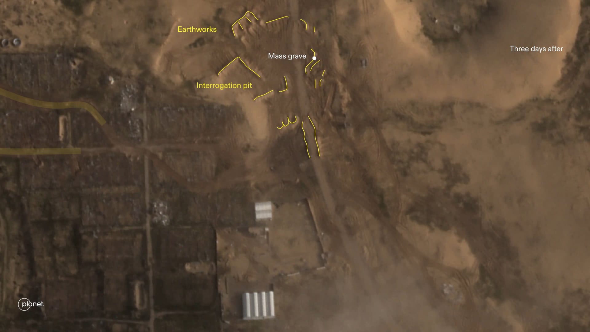 Earthworks in the hours after the attack transformed the incident site into a mass grave where the bodies and vehicles of the victims were buried. Later that day, an evacuation route was mapped through the site. Two checkpoints were established nearby, and a series of earth berms were built and later used for holding and interrogating Palestinians passing through the checkpoint.