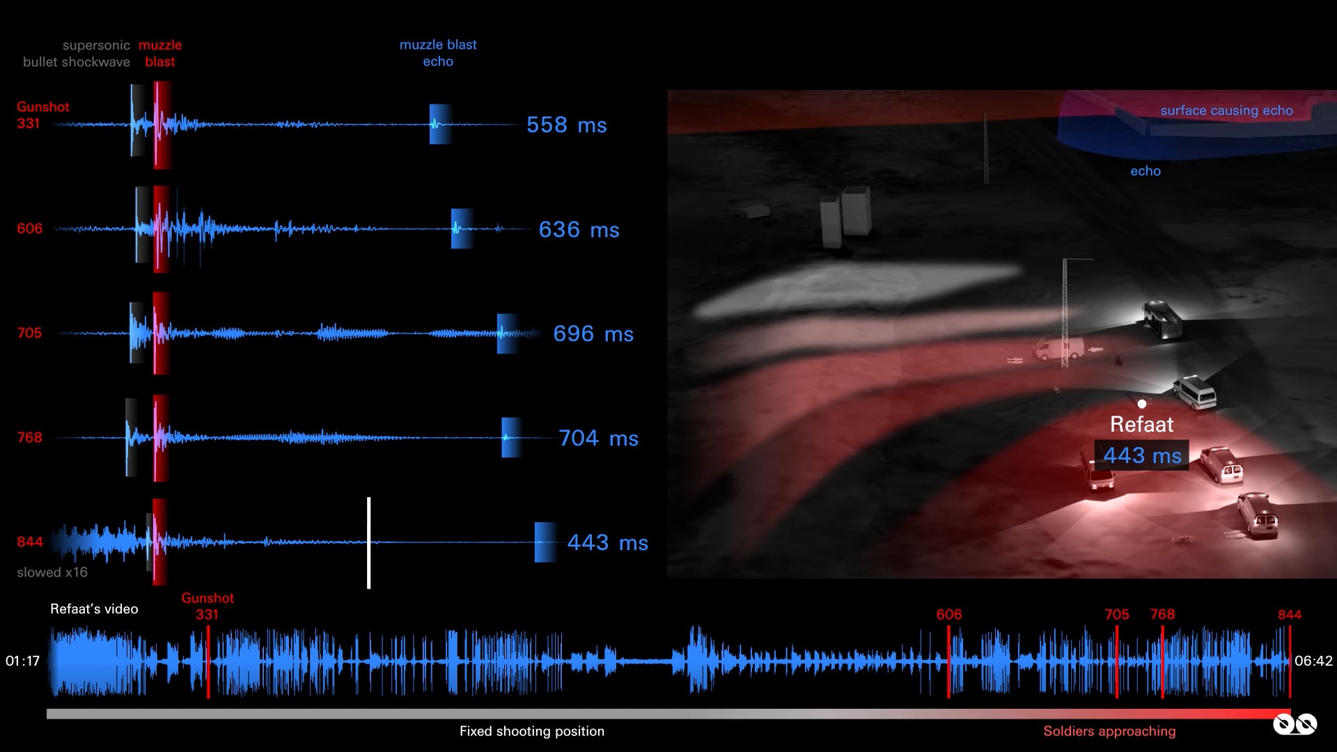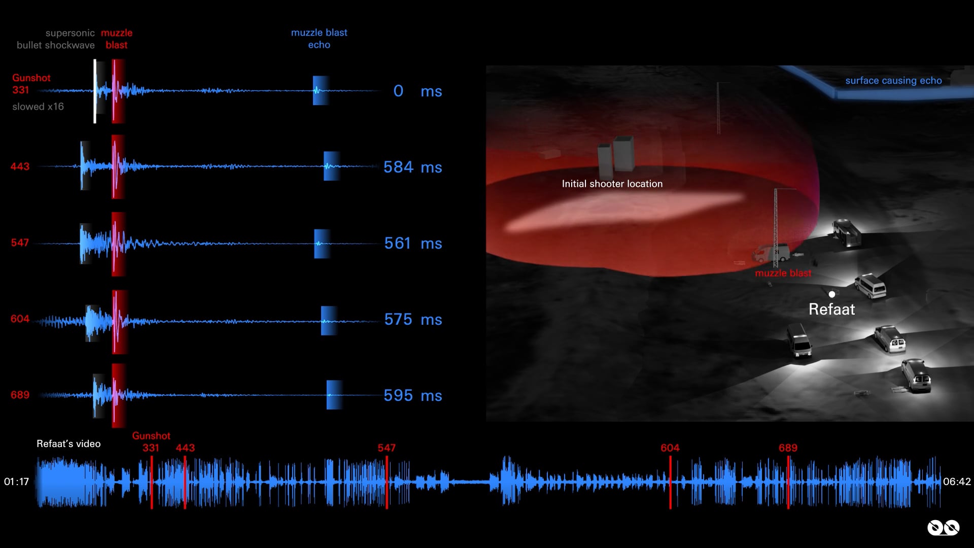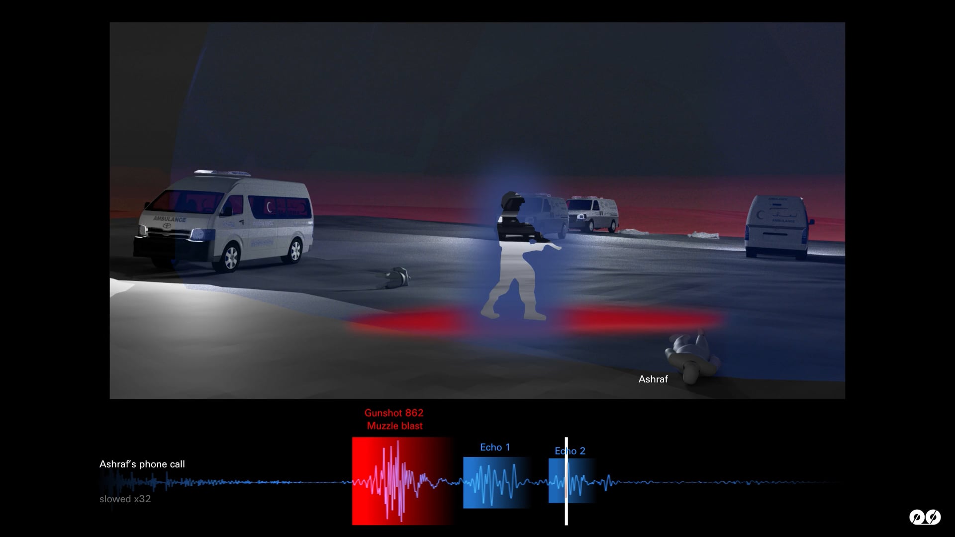 After Refaat’s video ends, Ashraf’s phone call continues for fifty-two seconds, capturing twenty-four additional gunshots. Eight of these shots each produced muzzle blast echoes reflecting from surfaces between three and twenty-four metres from Ashraf’s phone; the only surfaces within that range were the emergency vehicles themselves, indicating that the shooters were firing from between the vehicles, within metres of the aid workers. Audio analysis indicates that one of these shots was fired within one to four metres of Ashraf. These shots coincide with the last time Ashraf’s voice is heard, strongly suggesting that he was executed at close range.